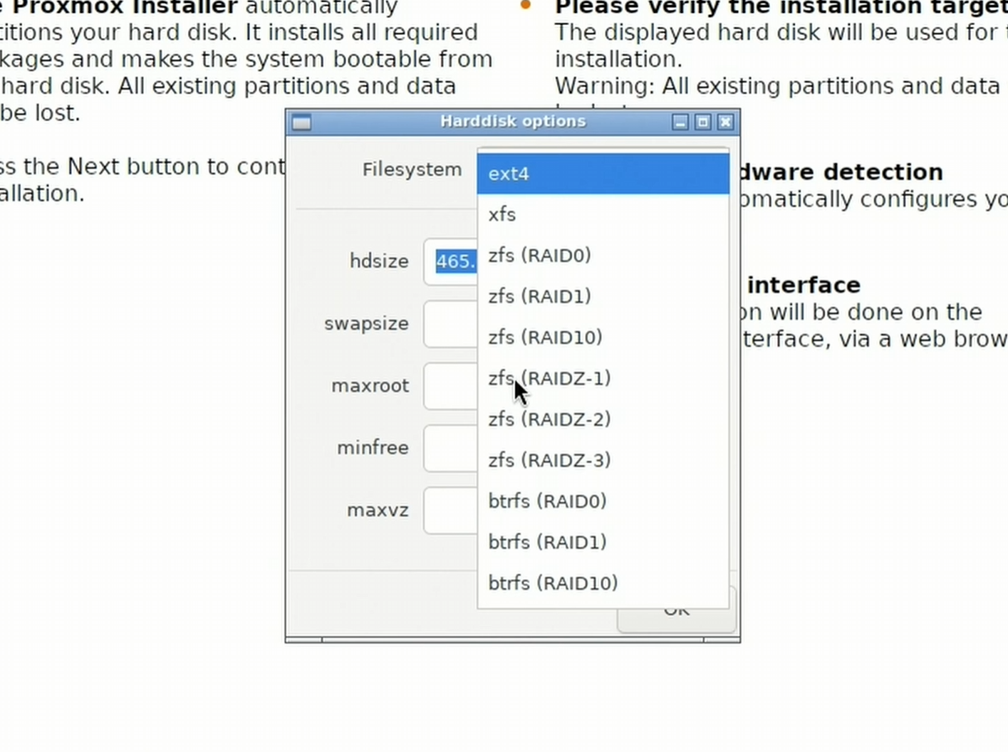 - After clicking “Options”, change the filesystem to “ZFS (RAID1)”.