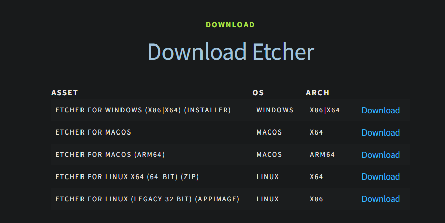 Navigate here and download Balena Etcher. This is a tool that runs on Windows, macOS and Linux that you will use to write the Proxmox VE ISO installer file to your USB flash drive.