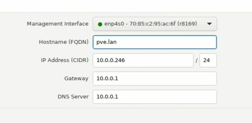 “IP Address” should already be autopopulated with whatever local IP address your router/DHCP assigned to your server. Because Proxmox uses a static IP address (meaning it will never change), I recommend changing the last octet to something you’ll remember easily.
