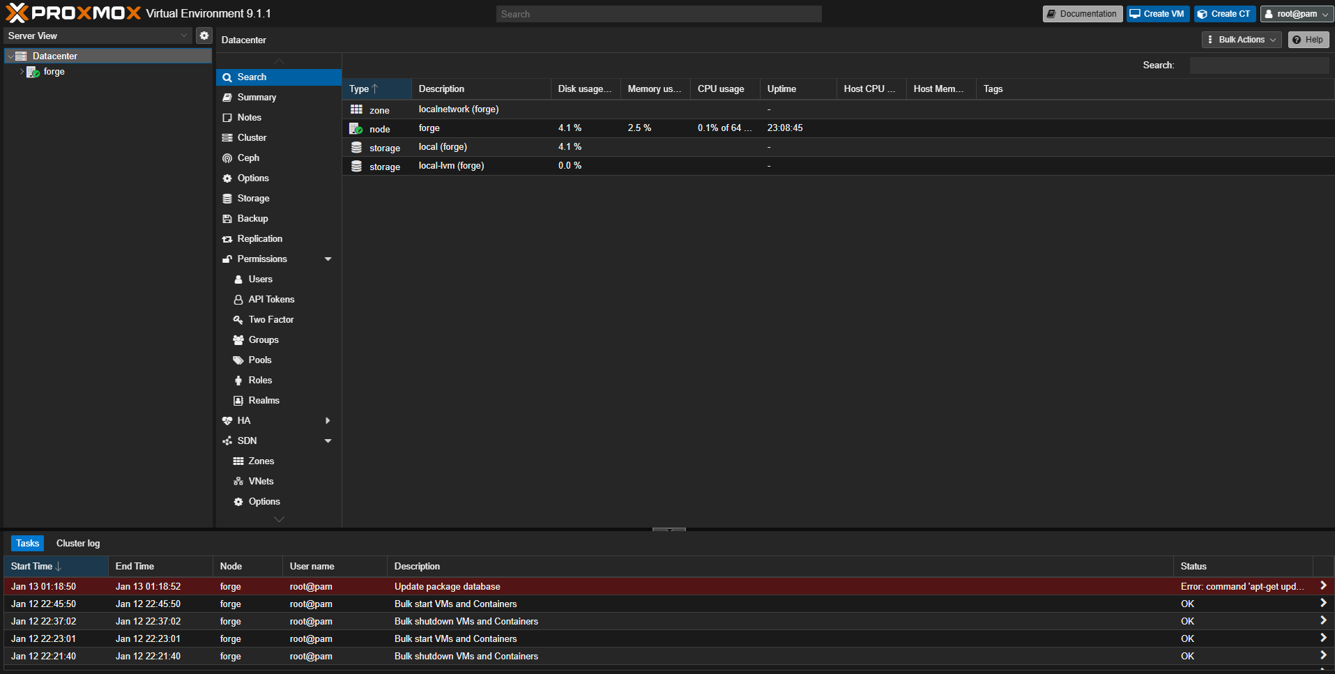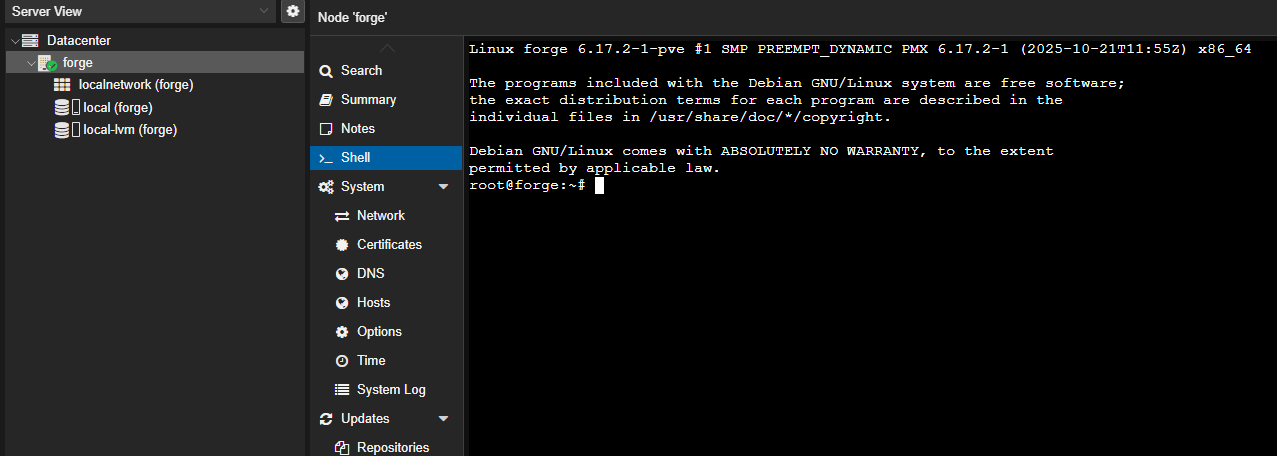 Under “Datacenter”, you should see a single node listed with the hostname you chose during the installation process (in the example below, it is displayed as forge). Click on this, and then on the menu to the right, click on “Shell”.