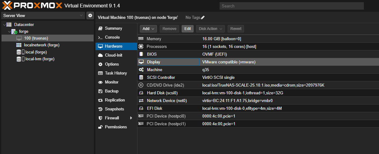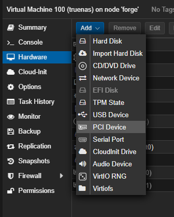 Under “Datacenter” > (your server node), select your TrueNAS VM and then click on the “Hardware” menu item.