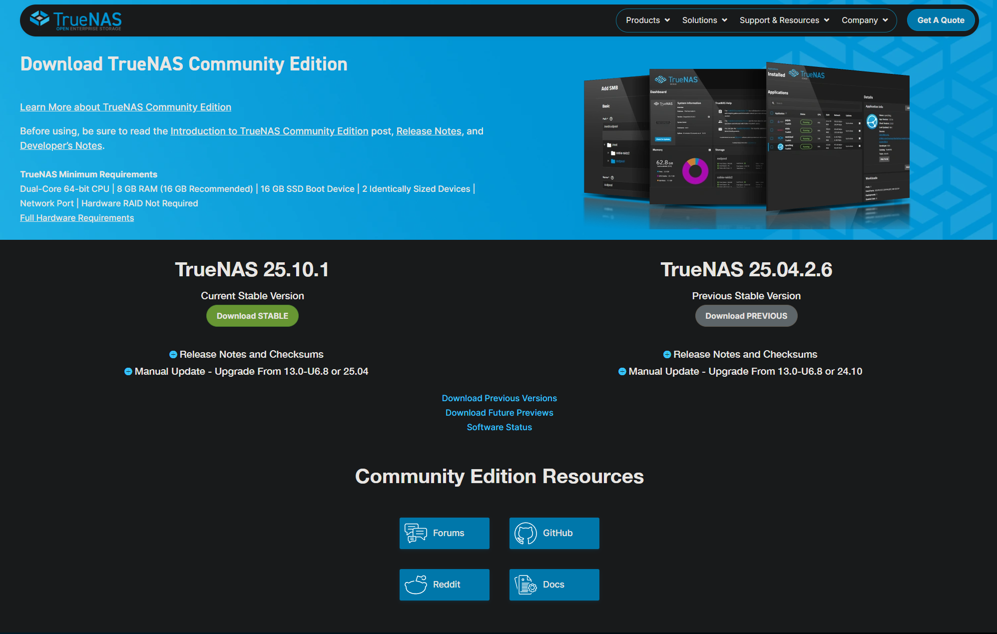 Navigate here to access the TrueNAS Community Edition download page. Click the “No thank you, I have already signed up” link in the bottom-right corner, then choose the Current Stable Version of TrueNAS by clicking “Download STABLE”.