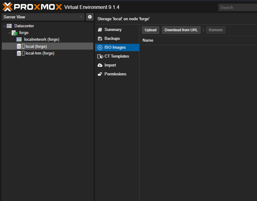 Back in your Proxmox web UI, under Datacenter > (your server node) > local, click on “ISO Images” in the menu to the right.