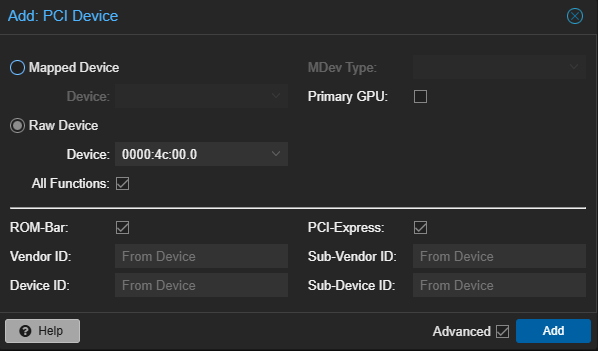 - In the “Device” dropdown, select the PCI ID of the controller you want to pass through