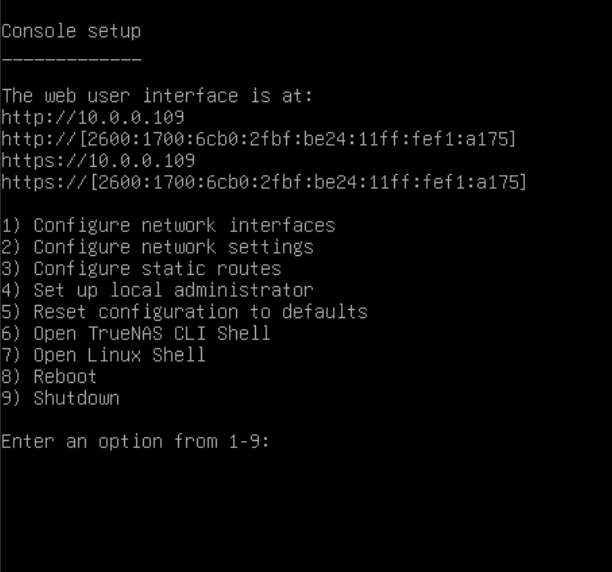 The TrueNAS VM was automatically assigned an IP address by your router/DHCP, in this example it is 10.0.0.109.