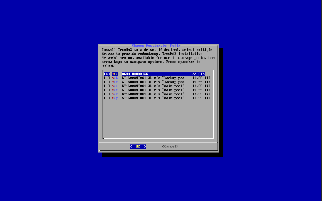 Next, we need to select the disk we want to install TrueNAS onto. Also, as a quick sanity check to confirm our controller passthrough is working, all of your hard drives should show up in the list of disks on this page, along with the 32GB virtual disk we set up when we created the VM. Use the arrow keys to highlight the 32GB virtual disk, then press Spacebar to select it, then press the Enter key.