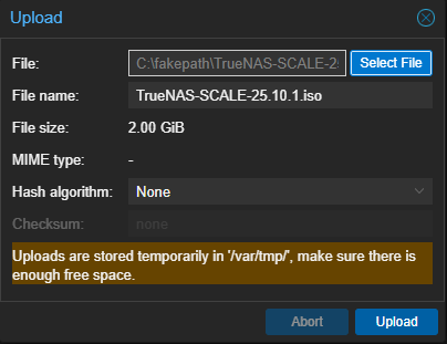 Click on the “Upload” button. In the window that appears, click “Select File” and then choose the TrueNAS ISO installer you downloaded earlier, then click “Upload”.